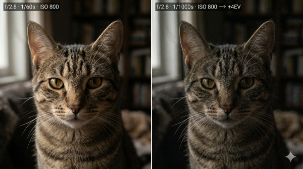 逻辑完全对称。画面大面积黑色(深色西装、黑色背景布、夜晚的街道),相机测到的平均亮度远低于中间参考值。它认为场景「太暗了」,于是开大光圈、放慢快门,把画面提到中灰。